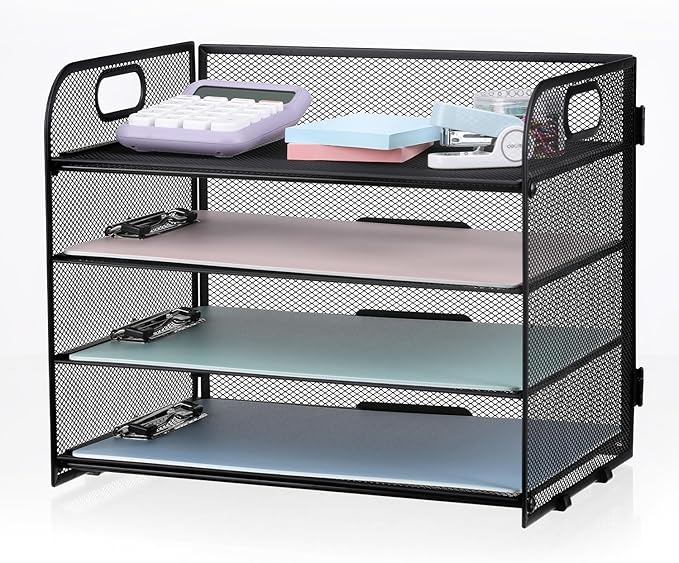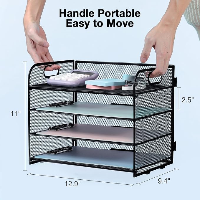 4-Tier Mesh Letter Tray Paper Organizer, Desk File Organizer with Handle - Black