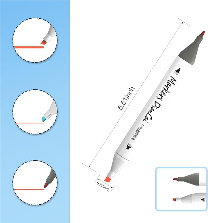 - Dual tip alcohol markers: Alcohol markers convenient double-tip design allows you to easily switch between creating clear details and laying lines of different thicknesses. Fine bullets provide precise line control for coloring and sketching, while chisel heads are suitable for filling, shading, and blending of paintings.