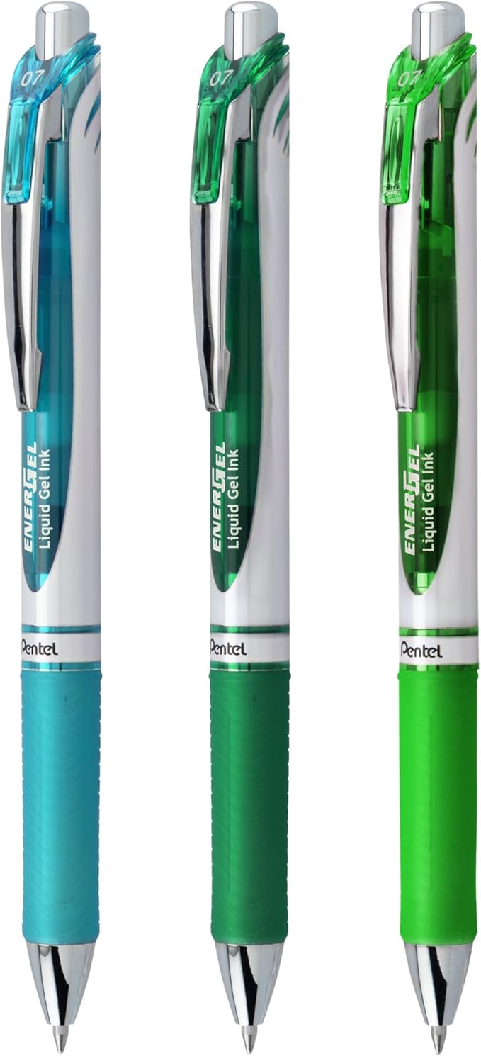 Pentel EnerGel RTX Retractable Liquid Gel Pen, 0.7mm, Chill Hue, Turquoise, Green, and Lime Green Ink, Pack of 3 Pens (BL77CHIBP3M)
