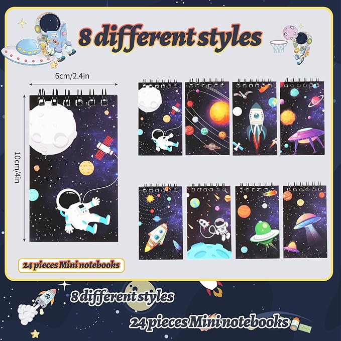 - What you get: outer space galaxy party favor set includes 100 pieces pencils in different styles,8 different patterns of 24 mini Spiral notepads and 24 pieces bookmarks in 12 styles. These will surely be a big hit at Planet Birthday Theme party. A very dazzling Science Astronaut Ship Rocket themed party bag filler provides something that boys and girls will love