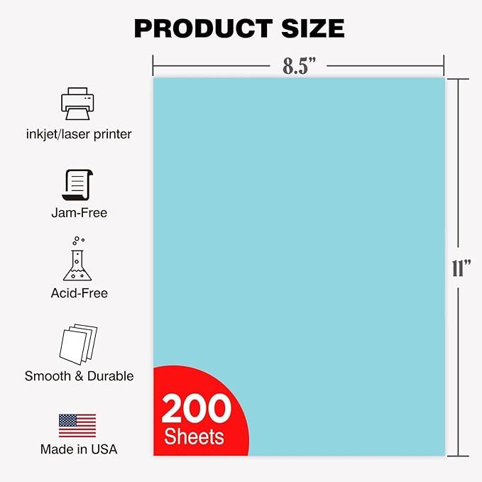 Veritas Color Copy Paper,Multi-Purpose paper,Colored Printer Paper 8.5” x 11”, 20 lb / 75 GSM,Blue,200 Sheets (1 Reams),Made in USA
