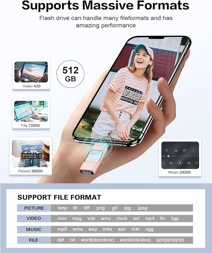 - Free Up Your iPhone Storage Space - With 512GB of additional storage capacity, you can easily transfer large files such as photos and videos from your iPhone to our external storage device. No need to worry about running out of space or expensive cloud storage services. With our USB flash drive for iPhone, carry all your important files with you wherever you go.