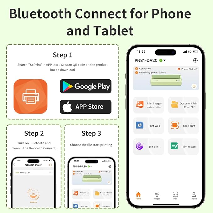 - Easy to Set Up: RONGTA portable thermal printer for travel go by bluetooth.Download "SoPrint" APP from Google Play or APP store for iOS and Android Phone or tablet.Connect the printer via bluetooth on the App, then it can easily print from your iPhone, iPad, or Android mobile, tablet.The inkless portable printer supports USB cable connection for Laptops,compatible with Windows 7-11 and MacOs for PC.