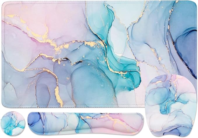 Keyboard Wrist Rest Large Mouse Pad Wrist Support for Computer, 4 in 1 Memory Foam Keyboard Pad Desk Mat Ergonomic Hand Rest Wrist Cushion for Home Office Gaming - Blue Marble