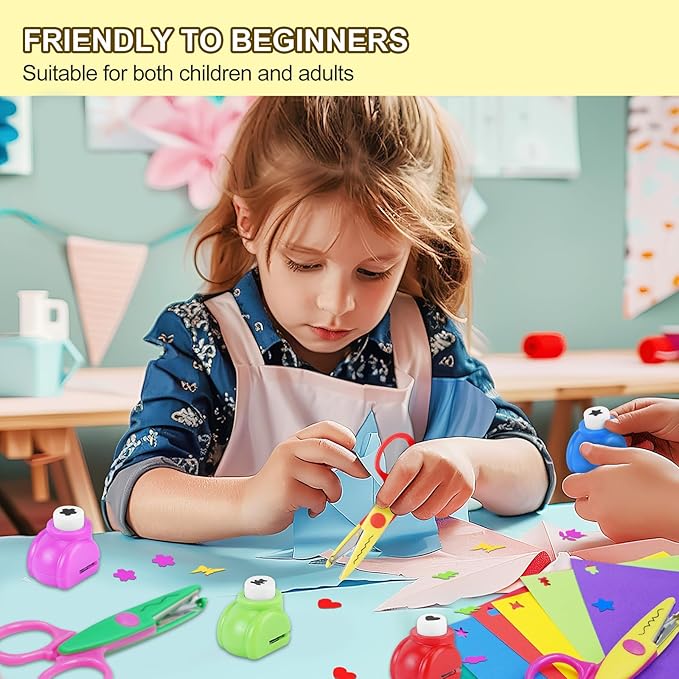 - ABUNDANT SETS : Including 8 piece 5 inch craft scissors + 6 mini paper puncher + 30 sheets colored cardstock in 15 different colors. Satisfy you and your child's crafting needs all at once