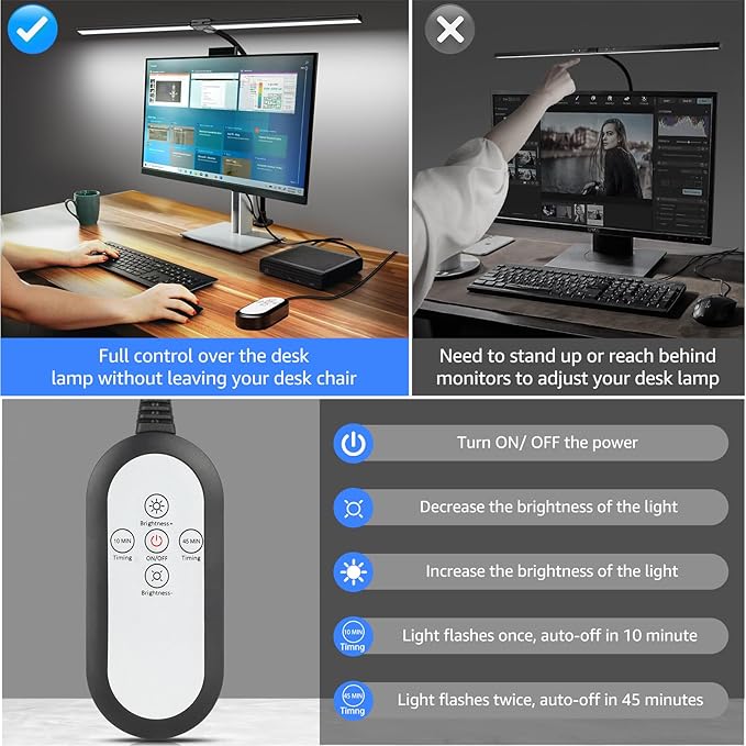 - Adjustable Brightness -- Easily customize your lighting experience by pressing buttons that allow for smooth adjustments. The single-color temperature mode (5000K) provides a balanced and natural lighting environment, and offers 10 brightness levels (10-100%), ensuring you find the perfect ambient brightness without flickering or glare. Whether you're engaged in office work, reading, writing, or other tasks, this desk lamp provides optimal illumination for enhanced productivity and comfort.