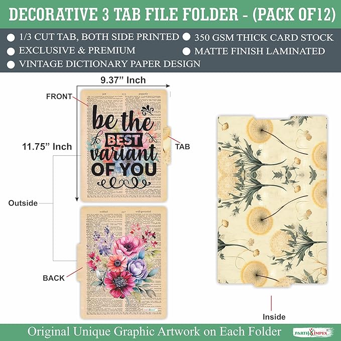 PARTH IMPEX 12 Pack Decorative File Folders, 1/3 Cut Tab with Assorted Positions, Letter Size Paper Holders (9.37” x 11.75”) Matte Finish Laminated for Office School Work - Motivational Quotes Design