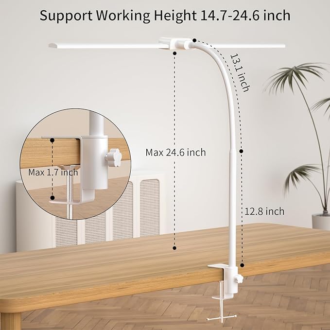 - 【Space Saving Separated C Clamp】This tall desk lamp comes with a separated C clamp allows it clamp-onto the max desk wide 1.7-inch and it takes up absolutely no desk space, the separated design allows the lamp mounted from any direction to accommodate your different lighting needs,the great solution for working from home.
