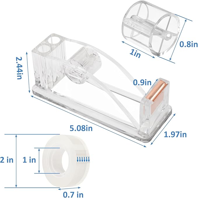 - Standard Size: 2 pcs transparent acrylic tape dispenser with a tape roll measures 5.08 x 1.97 x 2.44 inches, which fits standard 1 Inch tape refill rolls