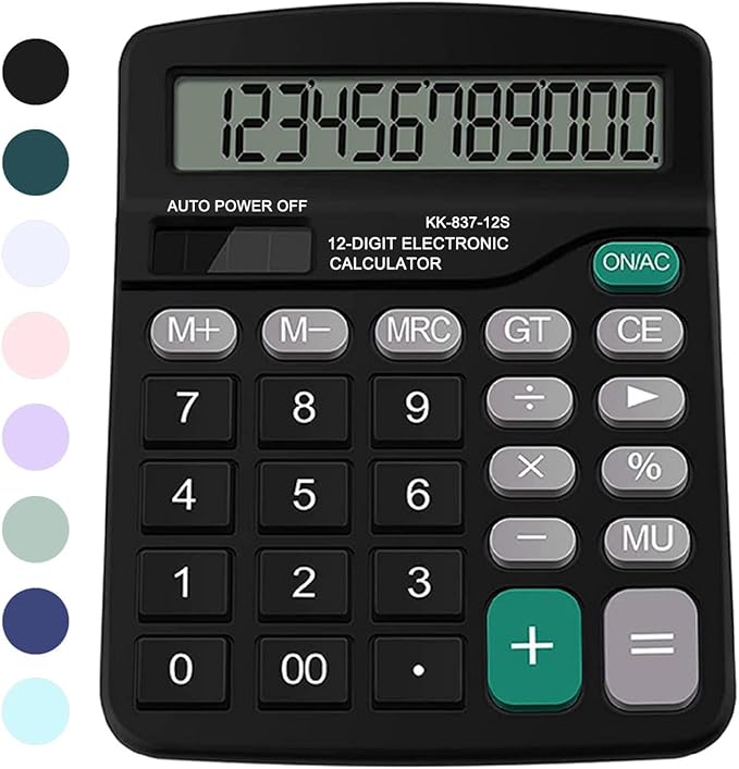 - [Mulit-Function] Add, subtract, multiply, divide, backspace, grand total, CE, %, M+/M-/MRC, ON/AC button, and auto Powr-Off. The desktop calculator will turn itself off after about 6 minutes of being idle.
