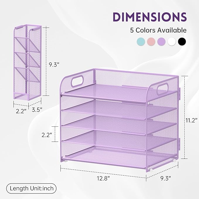 - [5 Tier Large Capacity] Upgraded SUPEASY purple desk organizer is 4+1 tier paper tray organizer. This paper organizer has 4 detachable trays which is perfect for holding letters, A4 paper, books, bills, magazines, mails, folders, notebooks and so on. The desk organizers can fully take advantage of your vertical space and keep your desktop clear and tidy.