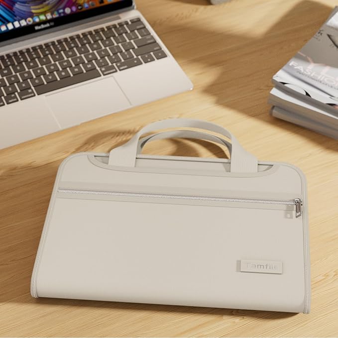 Tamfile Fireproof Accordion File Organizer with Handle, 13 Pocket Expanding File Folder with Zipper & Labels, File Folder with Multi-Pockets Paper Organizer Folder for Letter A4 Files, Beige