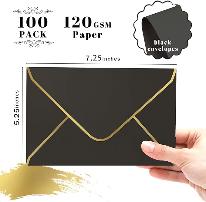 - BLACK ENVELOPES 5x7: High-quality thick paper, combined with the V-flap design, gives a beautiful and textured look; choose our black envelopes 5x7 with gold border to show your elegance and gorgeousness
