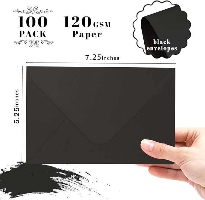 - 5.25 x 7.25 ENVELOPES: 100 Pack A7 envelopes for 5x7 cards which are made of FSC-certified paper; 120 gsm quality black paper; thick, sturdy and opaque, effectively preserve your good wishes and secrets; if you want a high-quality black envelope, this is the item for you