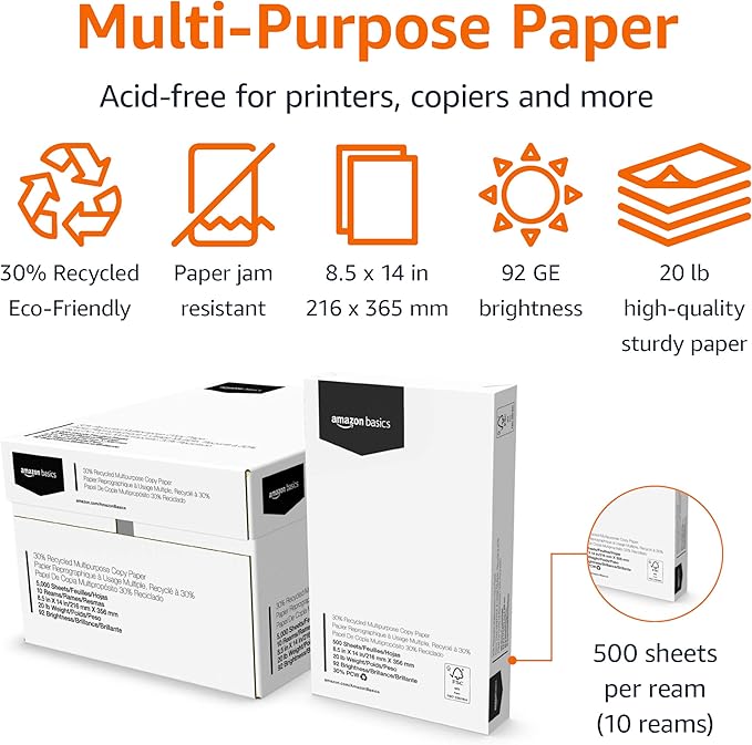 Amazon Basics 30% Recycled Multipurpose Copy Printer Paper, 8.5 x 14 Inches, 20 lb, 10 Ream, (5,000 Sheets), 92 Bright, White