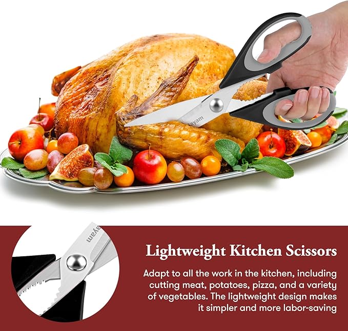 - Why choose our kitchen scissors? 1) Real full-size 8.5-inch kitchen scissors for all your culinary needs. 2) Soft handle for smooth, comfortable grip, perfect for wet hands. 3) These four-inch stainless steel scissors are very sharp, The micro-serrated blade design provides better grip on smooth surfaces like chicken and steak. 4) Comes with plastic sheaths to keep the blades clean and safely stored when not in use. 5) Built-in Bottle Opener: Conveniently open bottles while prepping meals.