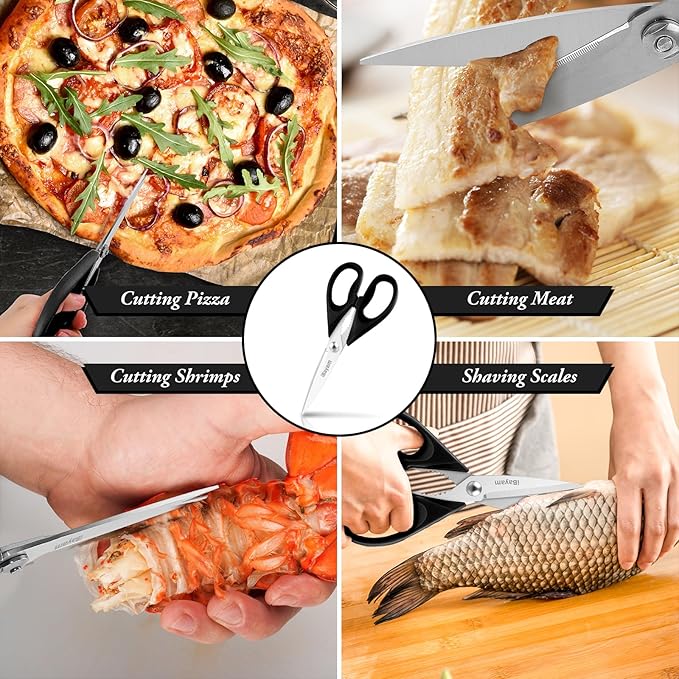 - ALL PURPOSE KITCHEN SCISSORS: Versatile kitchen tools perfect for cutting meats, vegetables, herbs, and more with ease. MULTI-FUNCTIONAL: Can also be used as a nutcracker, bottle opener, or unscrew lids.