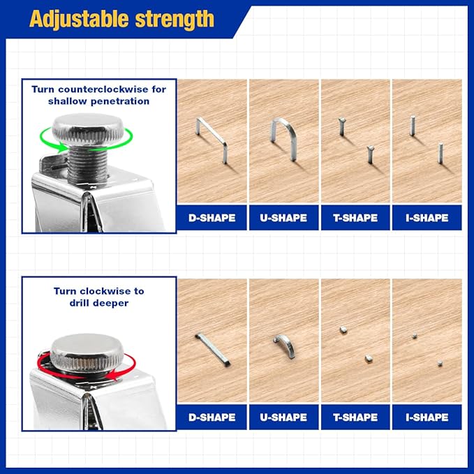 - 4-in-1 Heavy-Duty Staple Gun: Designed to drive D-, U- and T-type staples and brad nails, this staple gun features an adjustable pressure control for precise results on everything from delicate upholstery to dense hardwood, plus a jam-resistant mechanism for smooth, uninterrupted firing—reduce tool swaps and keep projects moving