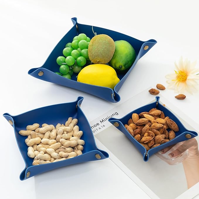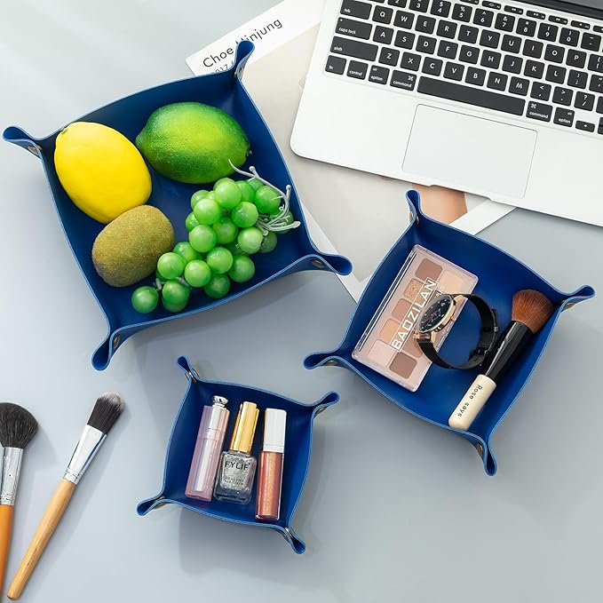 3 Packs Tskijun PU Leather Tray in 3 Sizes Jewelry Tray Glossy Leather Desk Organizer Leather Catchall Tray for Jewelry/Key/Coin/Sun Glasses/Watch/USB Cables etc. (Klein Blue)