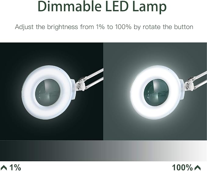 - 120 LED Professional Lighting System:Our magnifying glasses with Dimmable light feature energy-efficient LEDs that create a magnifying light for detailed tasks. The led desk lamp functionality provides flicker-free illumination as a lighted magnifying glass, reducing eye strain during magnifier for reading sessions or precision magnifying glasses work.