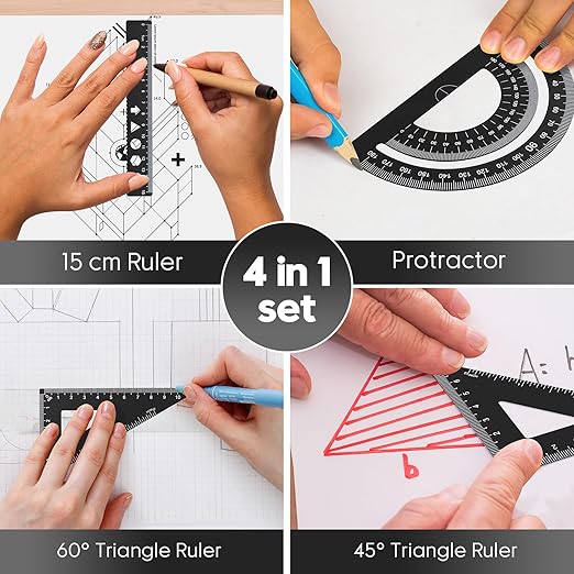 - Comprehensive Set: Our math geometry tool set includes 2 triangular rulers, 1 protractor, and 1 straight ruler, providing everything you need for precise mathematical measurements.