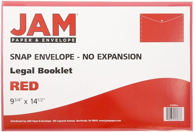 JAM PAPER Plastic Envelopes with Snap Closure - Legal Booklet - 9 3/4 x 14 1/2 - Red - 3/Pack