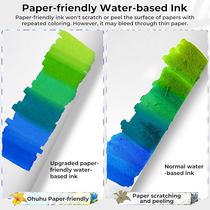 - PAPER-FRIENDLY NO PEELING WATER-BASED INK: These color markers feature Ohuhu’s upgraded water-based ink, designed to be paper-friendly(no peeling). Enjoy worry-free coloring without concerns of scratching, peeling, or smudging, even after repeated coloring. (Paper-friendly ink won’t scratch or peel the surface of papers with repeated coloring. However, it may bleed through thin paper.)