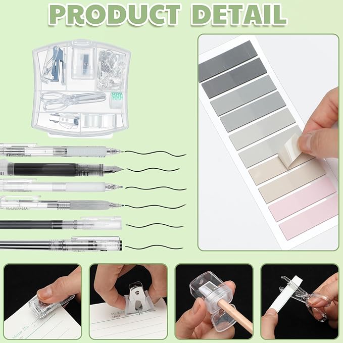 - Clear Suit: mini office supply kit includes 1 mini stapler, 1 sharpener, 1 tape dispenser, 1 scissor, 1 staple remover, 500 pieces of staples, 20 pieces of paper clips, 5 pieces of pens, 1 fluorescent pen, 12 pieces of long tailed clips, 1 note, 1 small telescopic knife and 1 box; A set of packaging can meet your various office and study needs and save your matching time