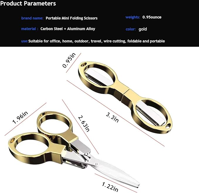 - MATERIAL: Folding mini scissors handle is made of aluminum alloy, the blades are made of carbon steel, tight and durable, not easy to rust, unfolded size: 3.7 x 1.97 inches (L*W); folded size: 3.1 x 0.96 inches (L*W).