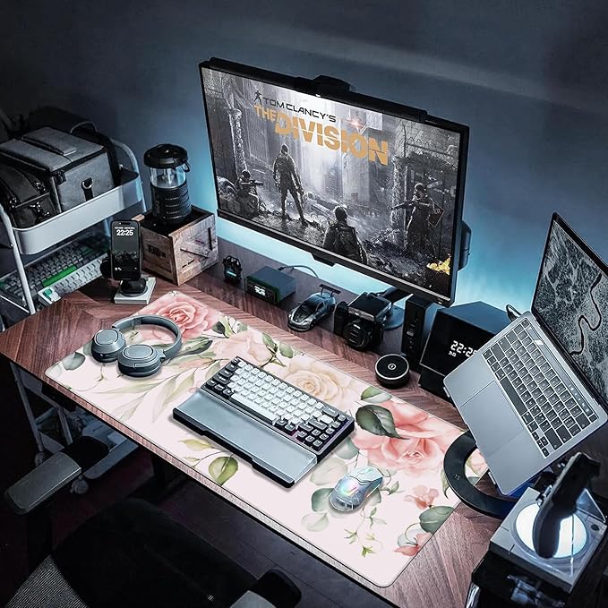 Desk Pad, Pink Watercolor Flowers and Green Leaves Extended Large Gaming Mouse Pad XXL, Large Desk Mat for Desktop with Non-Slip Rubber Base Stitched Edges for Home Office Gaming 35.4"X15.7"