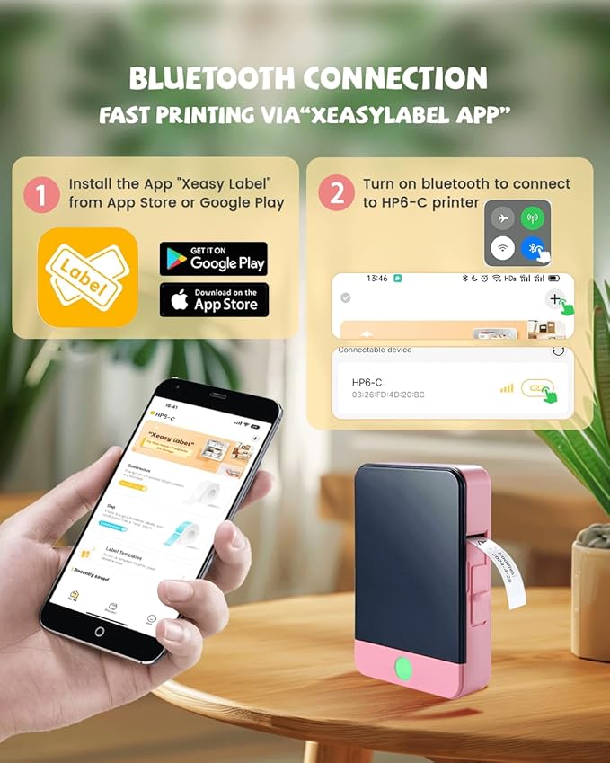 - Easy to Use-Bluetooth Connection: Vretti Small label maker compatible with IOS & Android Phones, connecting to your smartphone is a breeze. Simply pair your device, customize your labels, and then you can get a high-quality label printed instantly. Please note: The thermal label maker needs to download the "xeasylabel" app from Google Play or the App Store.
