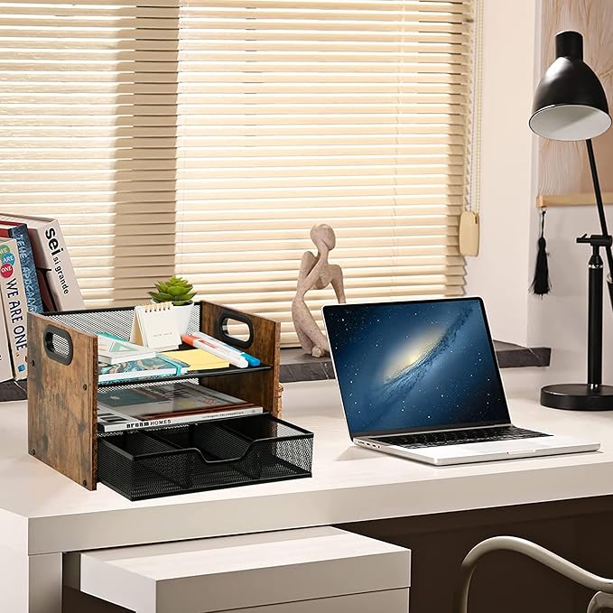 Wood Desk Organizer - 3-Tier Desktop File Organizer with Drawer, Wooden Paper Tray, Office Desk Organzier and Accessories for Papers, Mail, Notebooks, Stationery