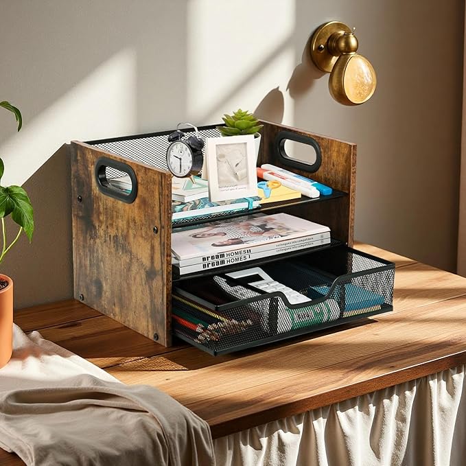 - 【File Organizer】 The metal mesh sides add a modern touch to your office decor while providing ventilation for stored items. With a sturdy wood board base and robust metal mesh compartments, this file cabinet for desk is built to last. The combination of materials ensures both durability and an attractive aesthetic that complements any desktop decor.
