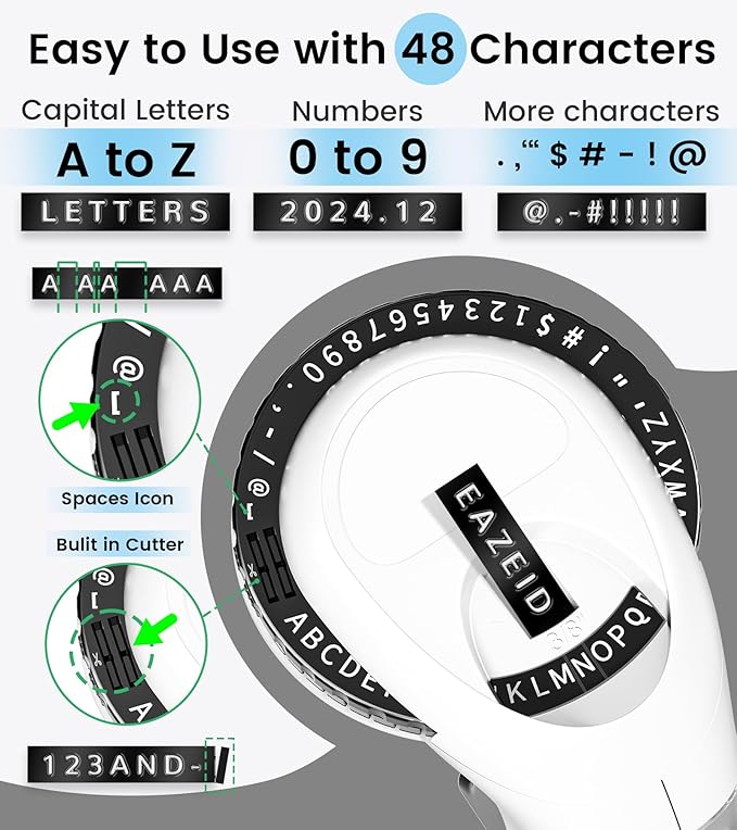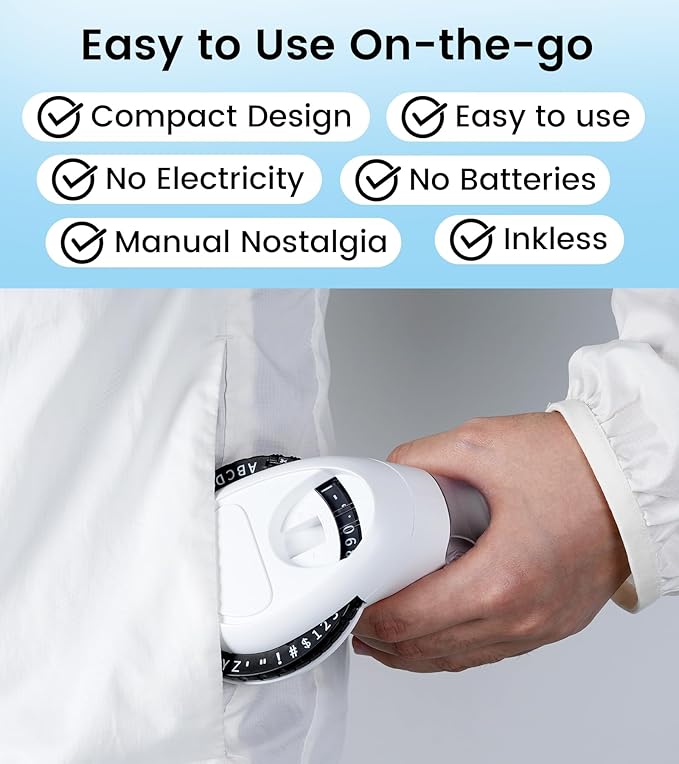 - Starter Kit with 48 Characters : Complete embossing label maker kit includes A-Z letters, 0-9 numbers, and symbols (! # $ . , - / @). Ideal starter kit for beginners and DIY enthusiasts,Scrapbooking. No batteries, ink, or electricity needed - just turn dial and press handle. Perfect manual handheld embosser for all ages, weighing only 149g for ultimate portability