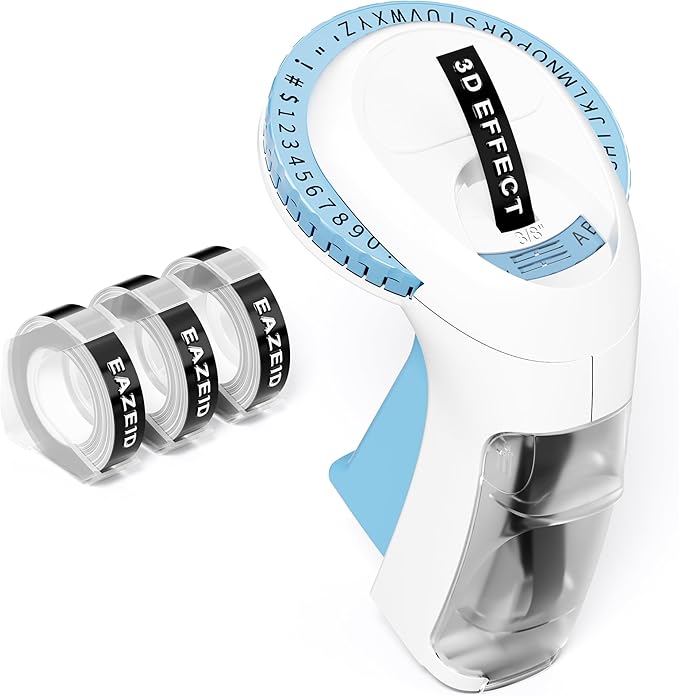- Manual Label Maker Embossed : The EazeID embossing label maker comes with a 3PK black 3D tape that people appreciate. This waterproof, stain-proof, and wear-resistant tape is easy to read, ensuring your labels remain legible even in challenging conditions. Plus, it offers excellent adhesion while leaving no residue when removed, making it suitable for both indoor and outdoor use