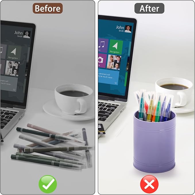 - Bright Color Design: These round desktop pencil cups are designed with colorful appearance and will be a great addition to your office desk. The cute metal pen holder is crafted with fine workmanship, smooth edges, even painting and silky polishing, which will give you a premium texture.