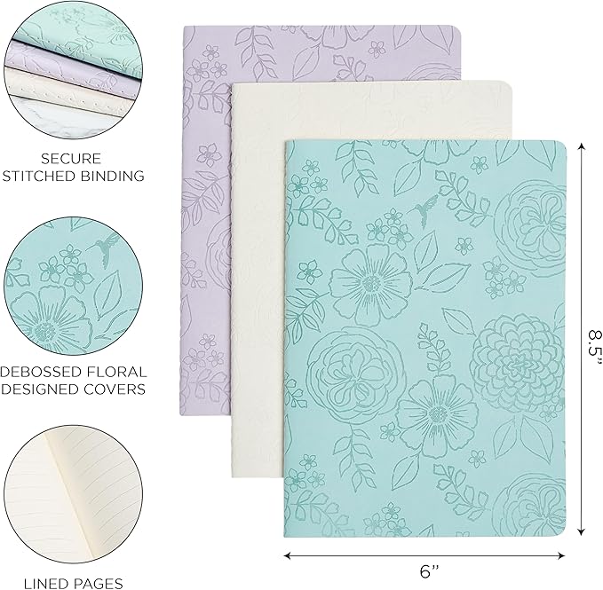 - This set features three stitched bound journals, in blue, ivory and lilac. Each journal has a biobased cover with an embossed floral print.
