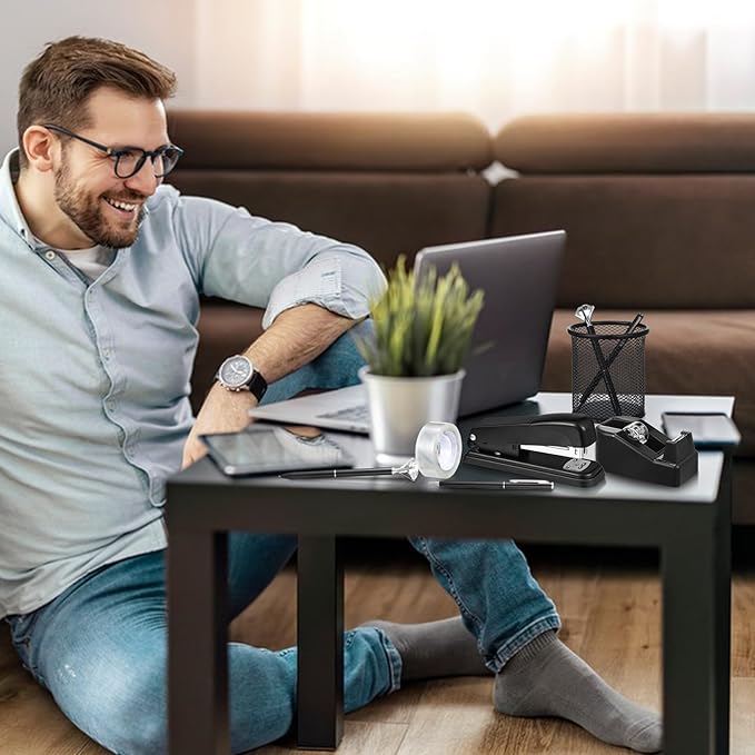 - 【Package List】You will receive a black office supplies set, including 1 black tape dispenser, 1 black stapler, 1 box of 1000 24/6 staples, 1 staple remover, 2 roll tapes, 1 pen holder, 1 scissors, 1 ruler, 1 sticky tabs, 2 ballpoint pens, 1 clip set (including 30 paper clips, 7 large binders, 15 small binders , 20 pins).