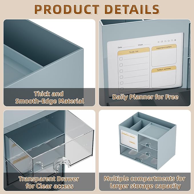 - 【Daily Memo for Free】This humanized desktop storage box is not only perfect for storing your desktop stationery but also great for doing your daily schedule. In particular, the daily planner is placed in the most visible place on the desktop, which can serve as a more prominent reminder and help you work effectively