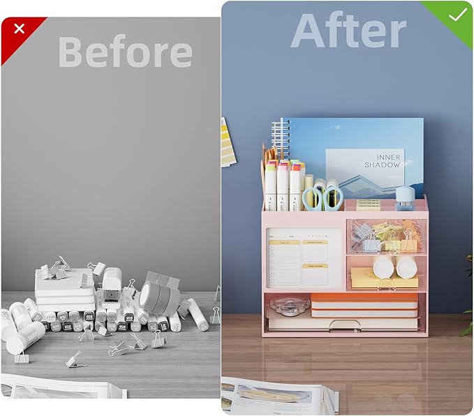 - 【Multifuction Desk Organizer】This Desk Caddy is no installation required not only perfect for storing your desktop stationery and many other desk widgets but is also great for storing your makeup brushes, nail polishes, lipsticks, and other small personal items sorted by type. The transparent drawer makes it way easier to find what you need! and You can put any other daily necessities on the organizer, It helps you keep your stuff organized