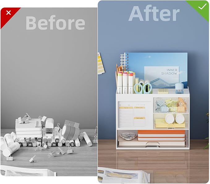 Marbrasse Desk Organizer with 3 Drawer, Multi-Functional Pencil Pen Holder for Desk, Desk Organizers and Accessories with 4 Compartments, Desktop Organizer Storage for Office Home Art Supplies (White)