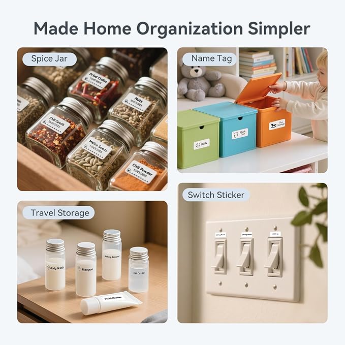 - Wide Application: The label maker printing width up to 15mm with a variety of styles of label tapes, such as 12X40mm, 14x30mm, 15x30mm and more, widely used in home storage and organization, school and office file classification, and small business, such as jar stickers, food date, cosmetics, personal items, barcodes, name tags, cable identification, price tags, jewelry labels, etc. It’s also the perfect back-to-school supplies and home helper