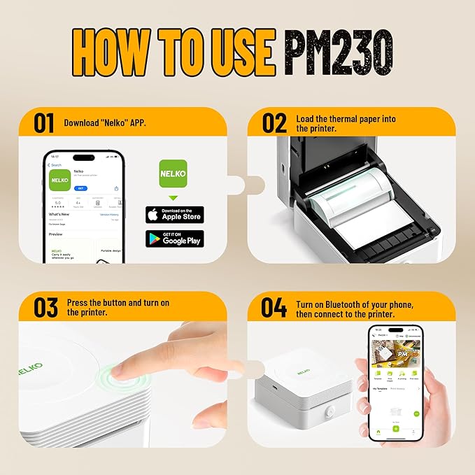 - Bluetooth Connection: NELKO mini sticker printer compatible with IOS & Android Phone via bluetooth connection. Step 1: Download "Nelko" APP from Google Play or App Store. Step 2: Long press the printer switch and the white light flashes. Step 3: Turn on the phone bluetooth. Step 4: Open the"Nelko" App and click "Un connected", refresh and click "PM230" and connect. To start printing, please refer to the instructions and follow the instructions. Does not support computer printing