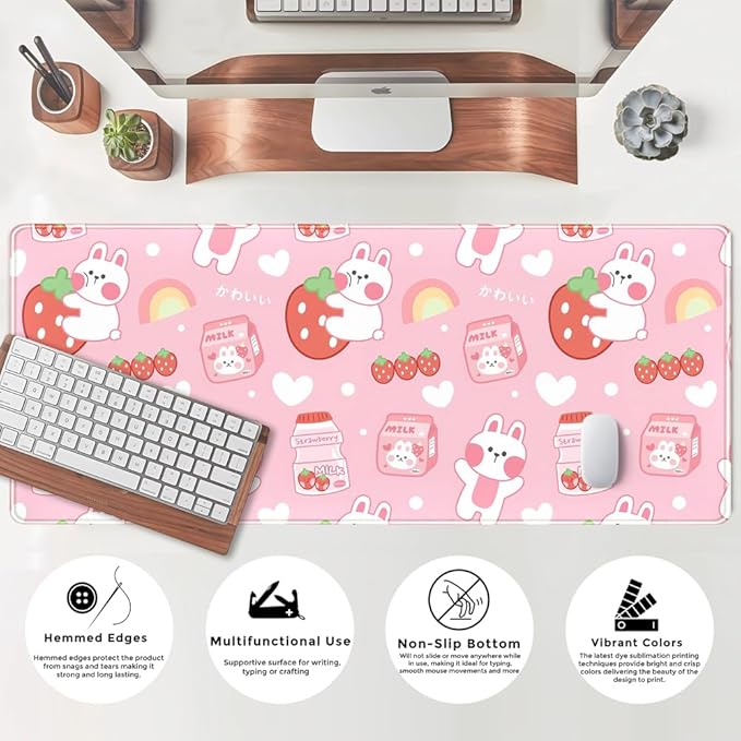 Cute Milk Rabbit Pattern Desk Mat Pink Mouse Pad Office Gaming Pink Cute Office Supplies Decor for Women Desk XL Computer Mouse Pad Accessories Desk Pad 31.5x11.8In with Stitched Eges