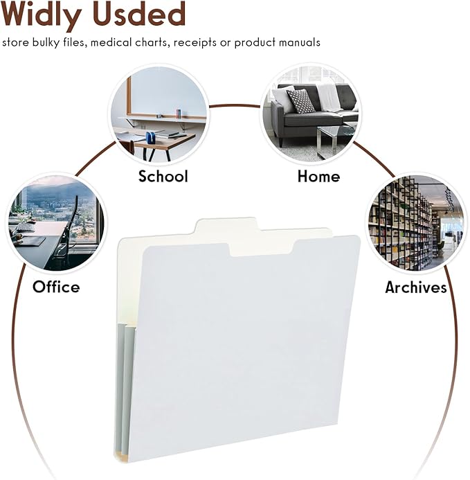 - Neatly File - 1/3 cut Build-in tabs are design for clear identification, can take well visible for quick positioning and easy file sorting. The filing folders can store bulky files, medical charts, receipts or product manuals