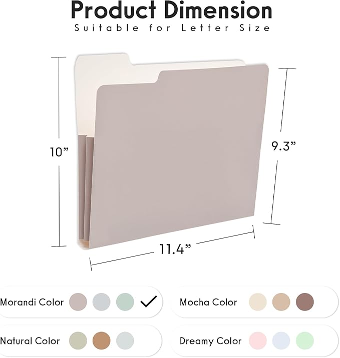 - Folder Dimension - 11.5" W x 9.5" H, for letter size paper. You will receive 6 file folders(3 Morandi Color x 2). For any accessory lost, please free to contact us