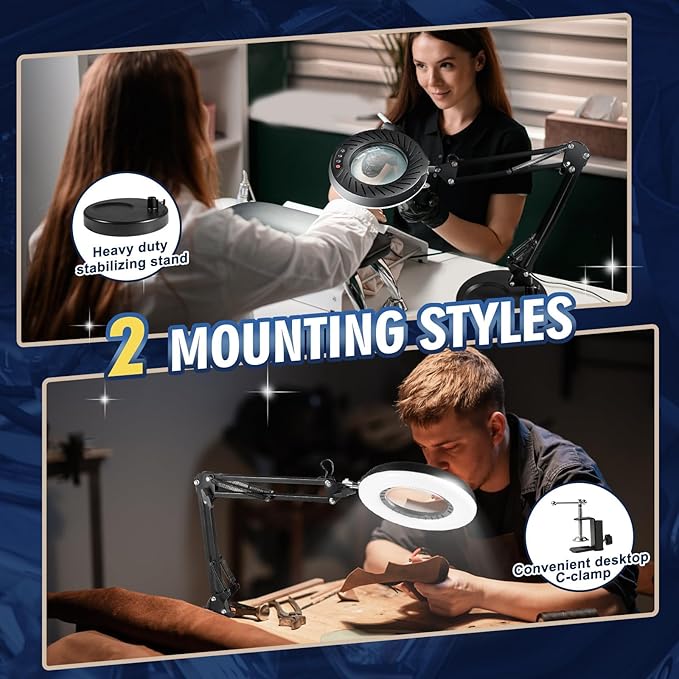 - 【Easy to Install and Use】This magnifying desk lamp features tool-free setup and USB power (works with outlets/power banks). The LED magnifying lamp with adjustable clamp is perfect for crafts, reading, and detail work. A versatile desk lamp with magnifying glass and light for any task.