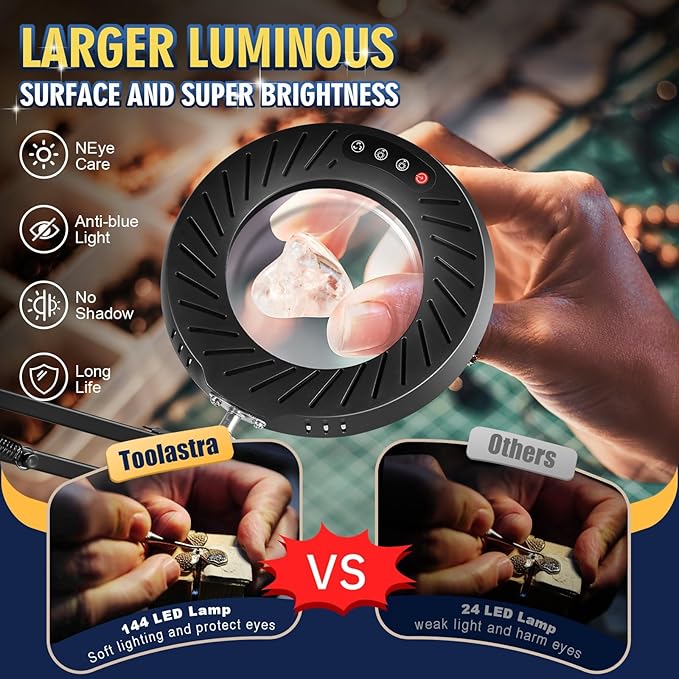 - 【144 LEDs Brightest Magnifying Lamp】 With 144 LED beads, this magnifying lamp with light is the brightest available. The built-in ultra-bright LED magnifying light provides clear visibility even in low-light conditions, reducing eye strain. The evenly distributed light minimizes shadows and enhances clarity, making detailed work more comfortable and efficient.