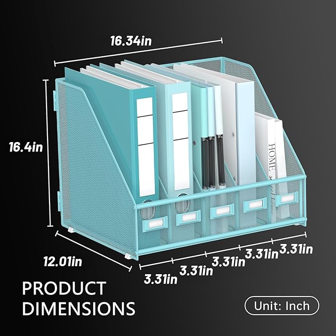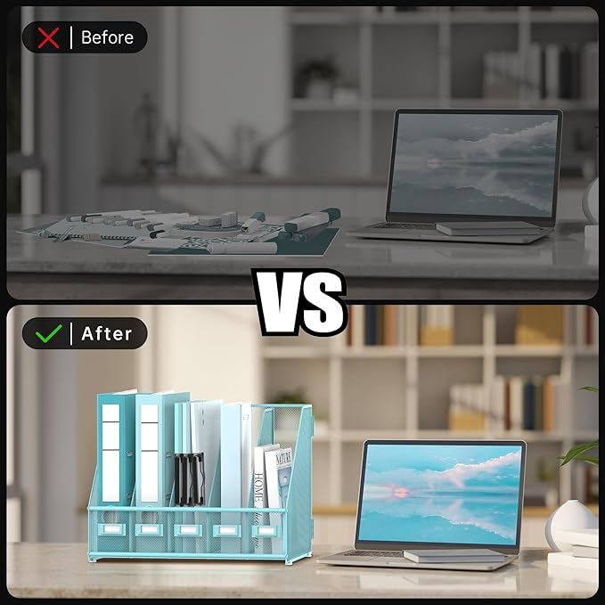 - Space-saving: This file folder organizer has 5 upright dividers for desk storage, taking the best use of vertical space on your desk. If your office space is limited, our desk file organizer can help you get rid of piled of files and have a tidy workplace.
