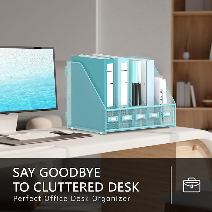 DALTACK Desk Organizers Metal Magazine File Holder with 5 Vertical Compartments Folder Storage Binder Organizer for Office Home School Organization, Blue Plus